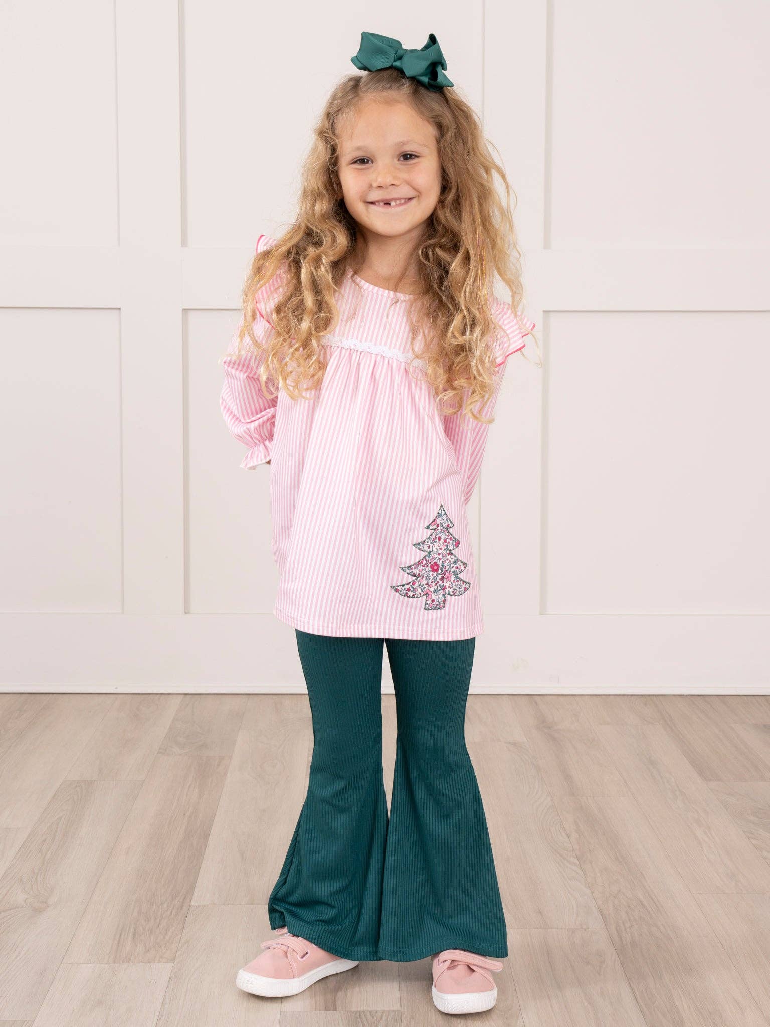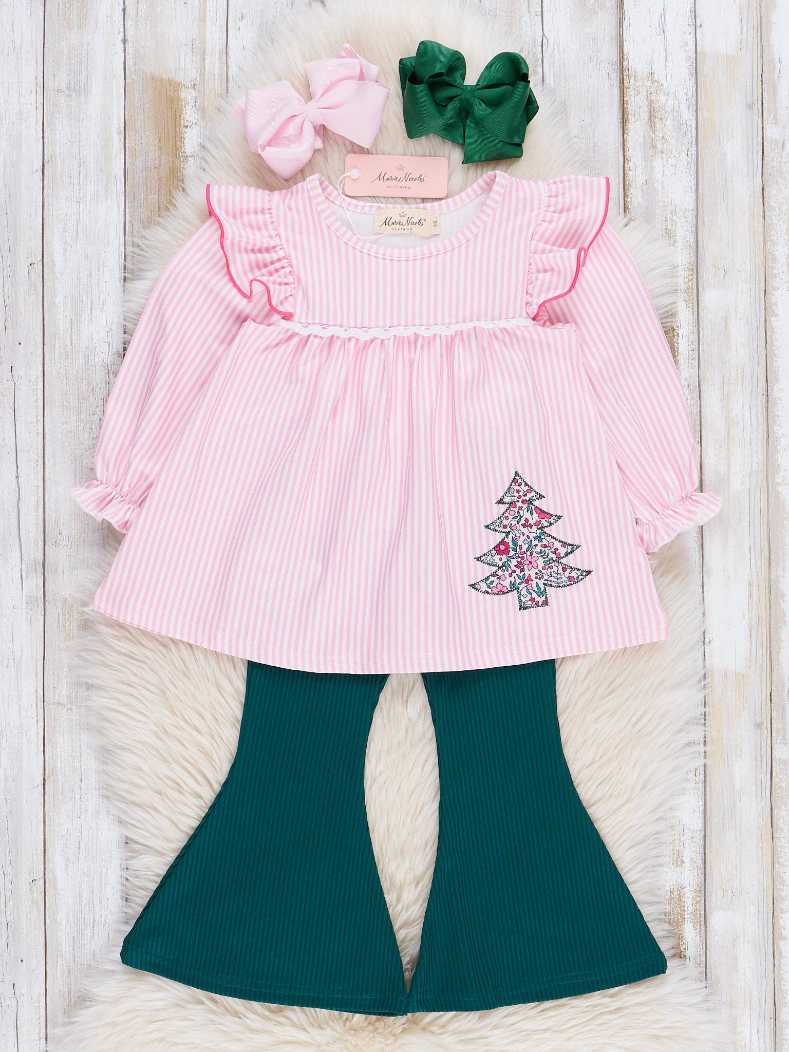 Pink Striped Embroidered Floral Trees Bell Bottoms Outfit