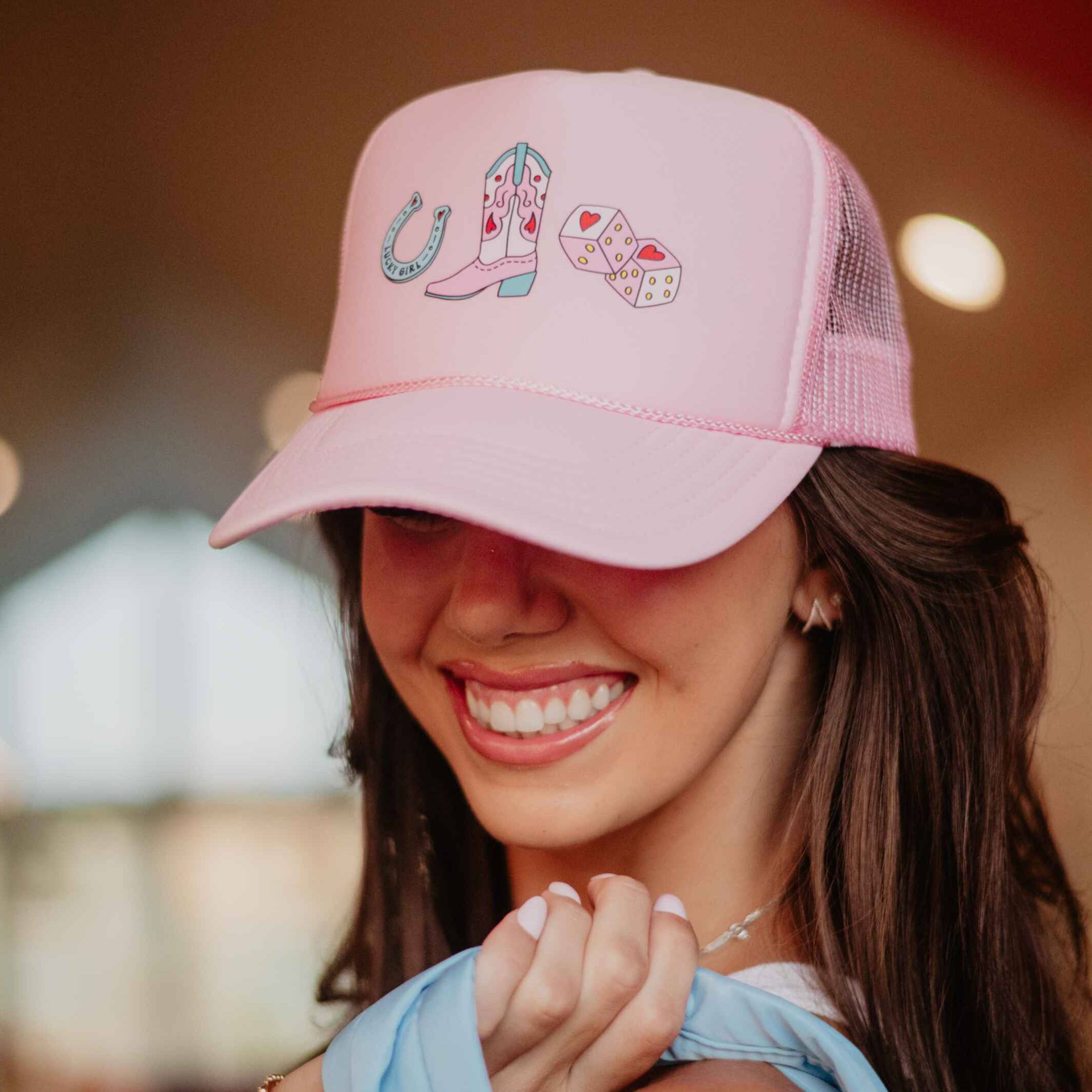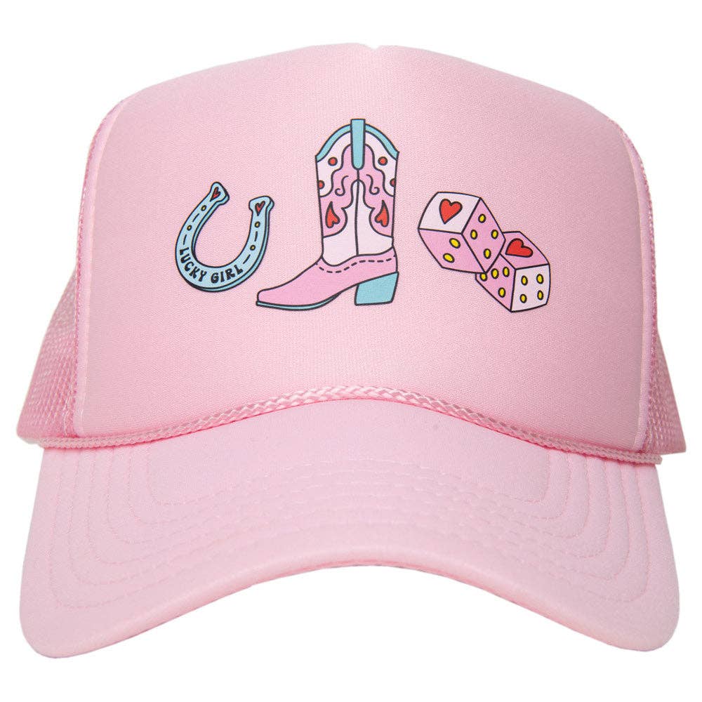 Cowgirl Boot Horeshoe and Dice Female Trucker Hats
