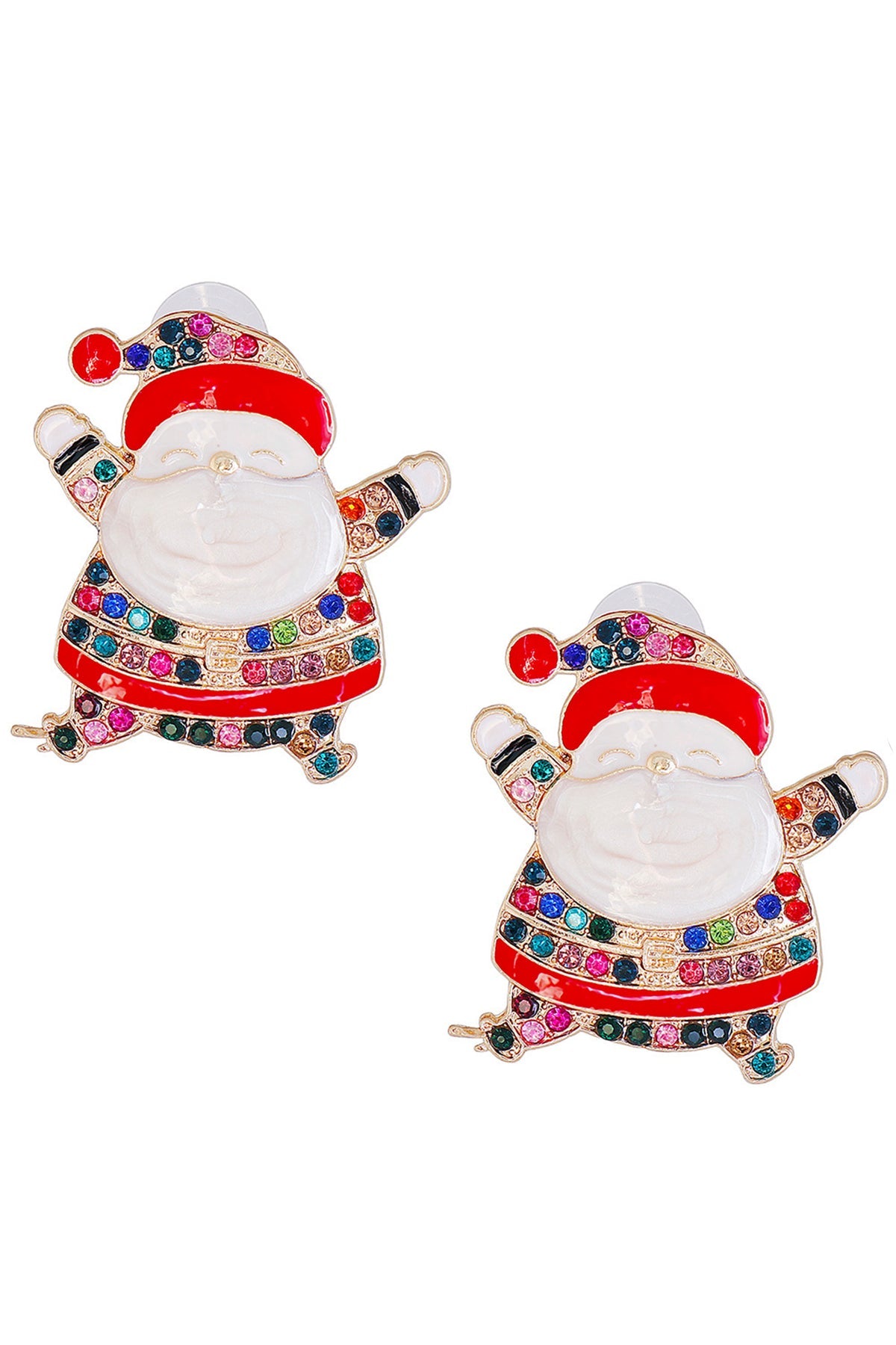 These earrings feature a jolly Santa (dancing, of course!) adorned with multicolored rhinestones. Definitely a playful and colorful addition to your holiday outfit! Dazzle and delight with a festive touch to your festive ensemble! These glimmering earrings showcase a cheerful Santa (dancing to the beat!) decked out in vibrant rhinestones. Your holiday style just got a playful upgrade!